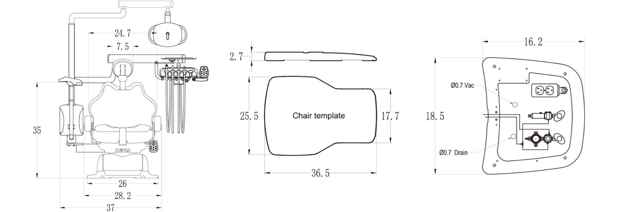 City water/bottled system, Water outlet and air QD, Swing assistant tray with touchpad,